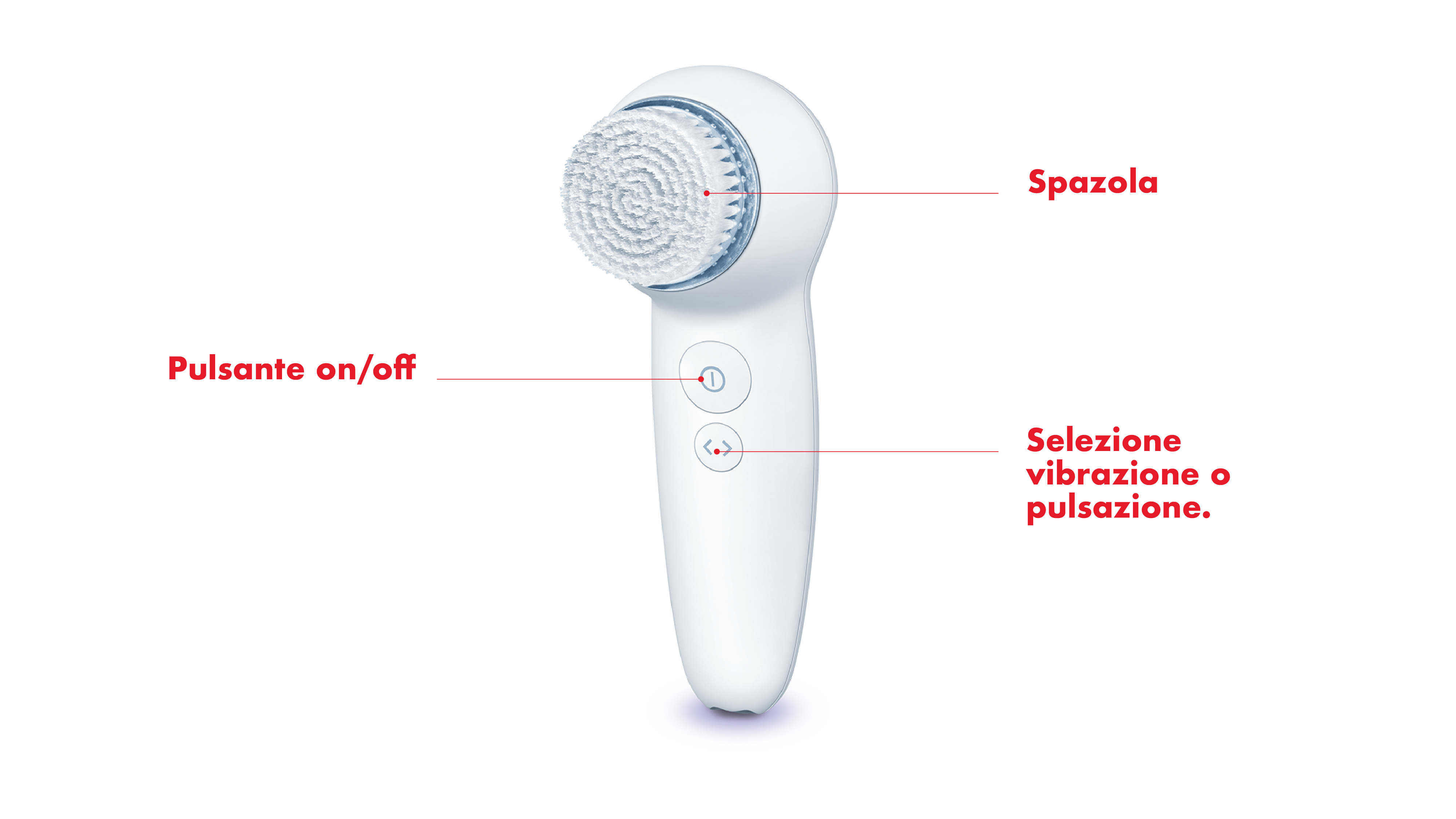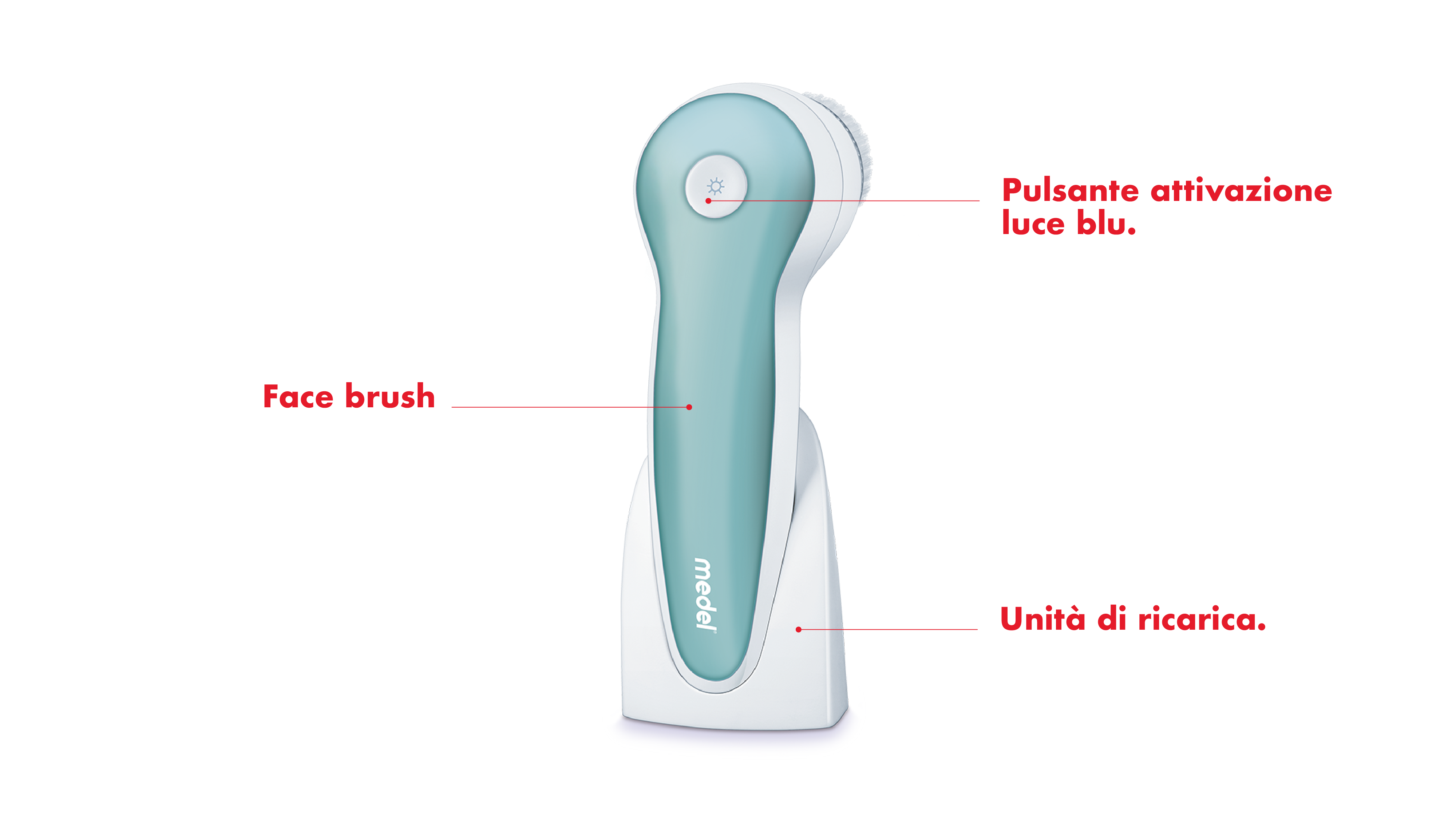 Con due funzioni integrate: vibrazione e pulsazione per una pulizia particolarmente accurata, Medel Face Brush è dotata di luce blu, ideale per il trattamento di brufoli e di altre impurità della pelle del viso.