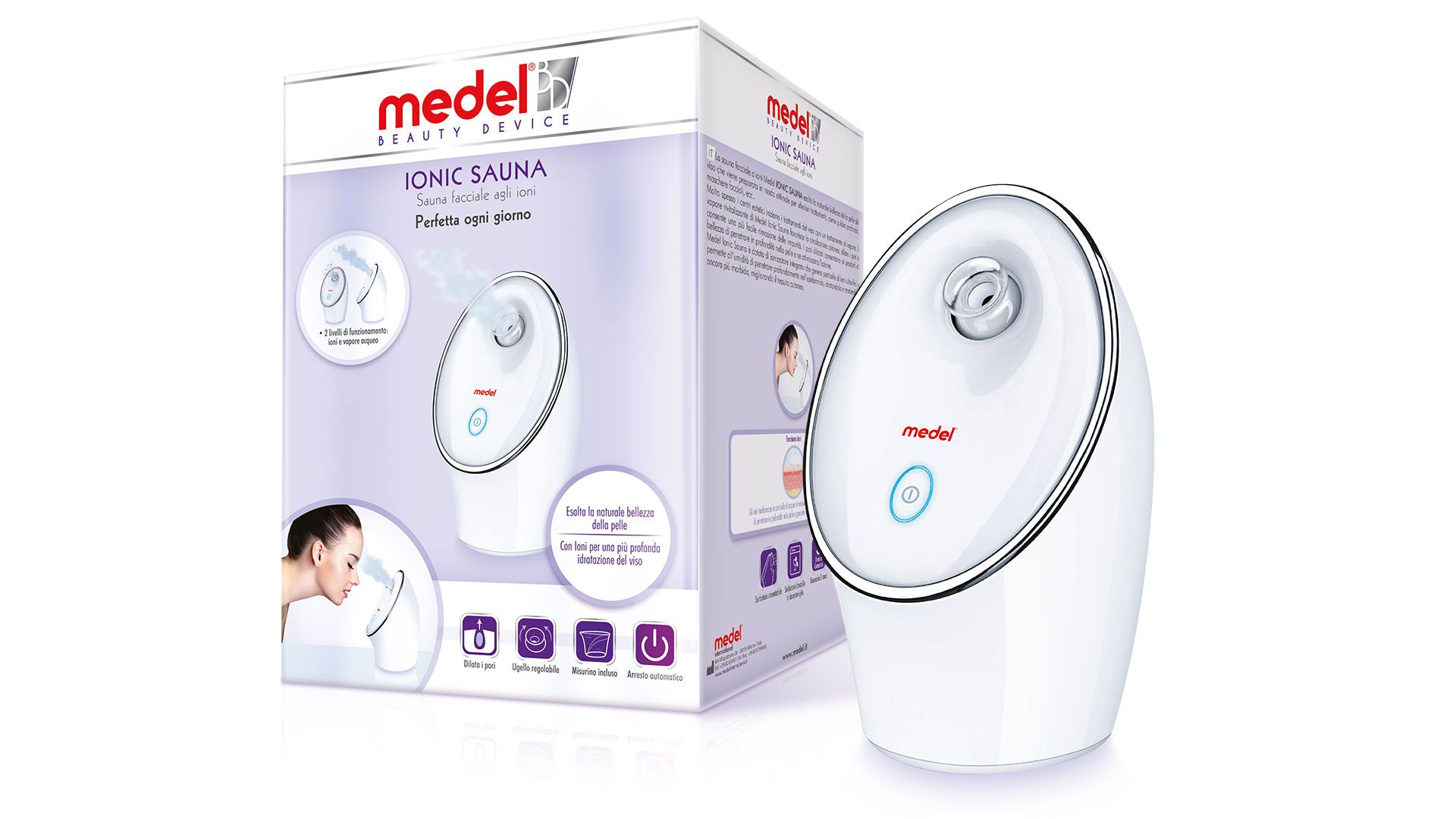 Il vapore rivitalizzante di Medel Ionic Sauna favorisce la circolazione cutanea, dilata i pori e consente una più facile rimozione delle impurità. I pori dilatati consentono ai prodotti di bellezza di penetrare in profondità nella pelle e ne ottimizzano l’azione.