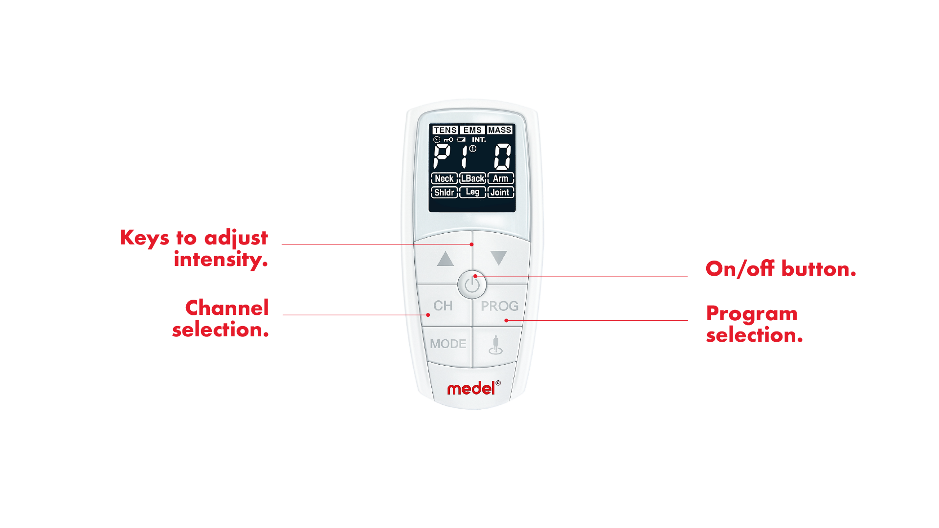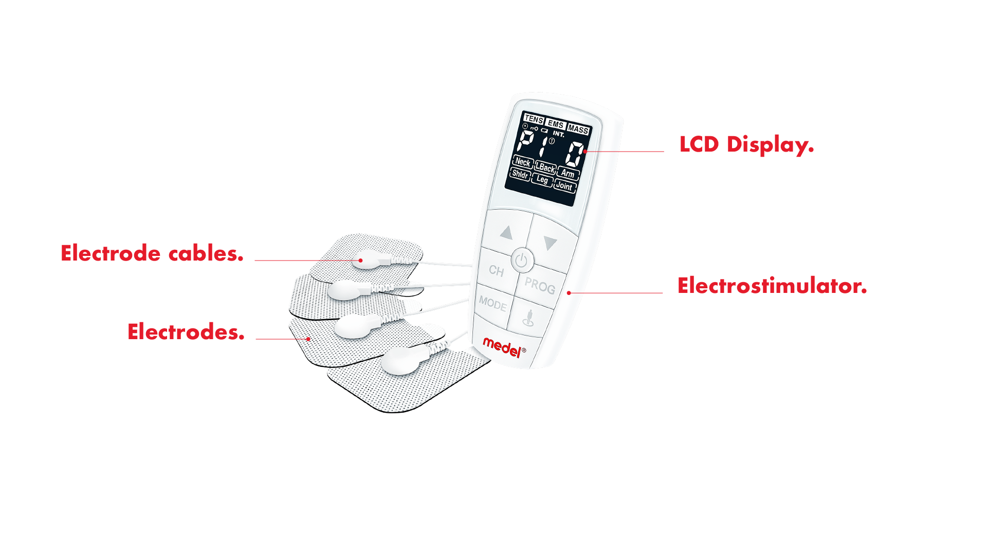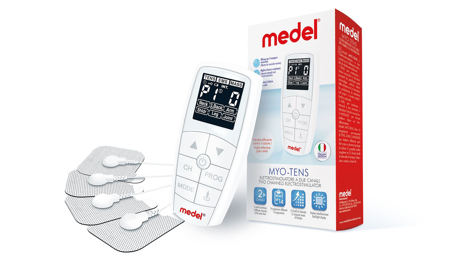 Medel MYO-TENS is a palmtop dual channel electronic stimulator for muscle stimulation (EMS) and pain relief (TENS). Thanks to its 14 programs divided into Tens (6), Ems (5), Massage (3) it is ideal for both amateur and professionals.