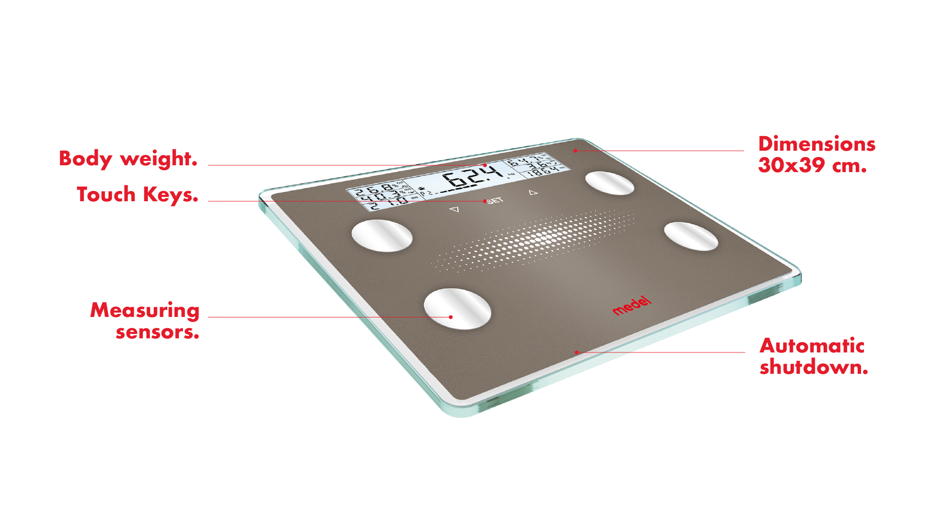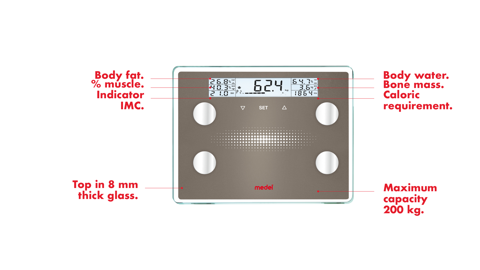 Medel Diagnostic XXL calcule le poids corporel, la graisse corporelle, l'eau corporelle, le rapport musculaire, la masse osseuse et les besoins caloriques.