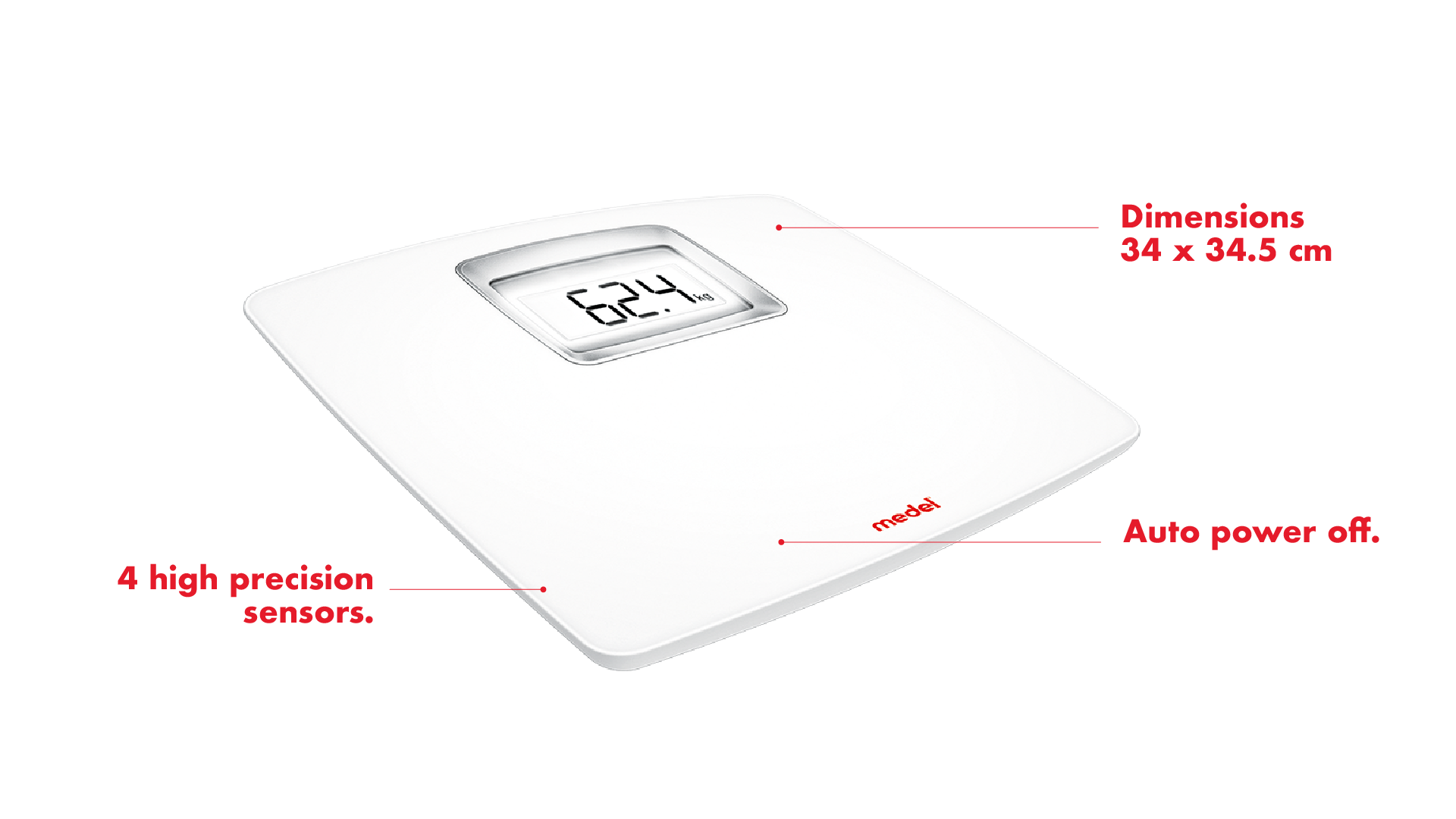 Medel DIGITAL est la balance numérique dotée d'un écran LCD extra-large et facile à lire avec rétroéclairage blanc. Livré avec un design élégant adapté à n'importe quel environnement.