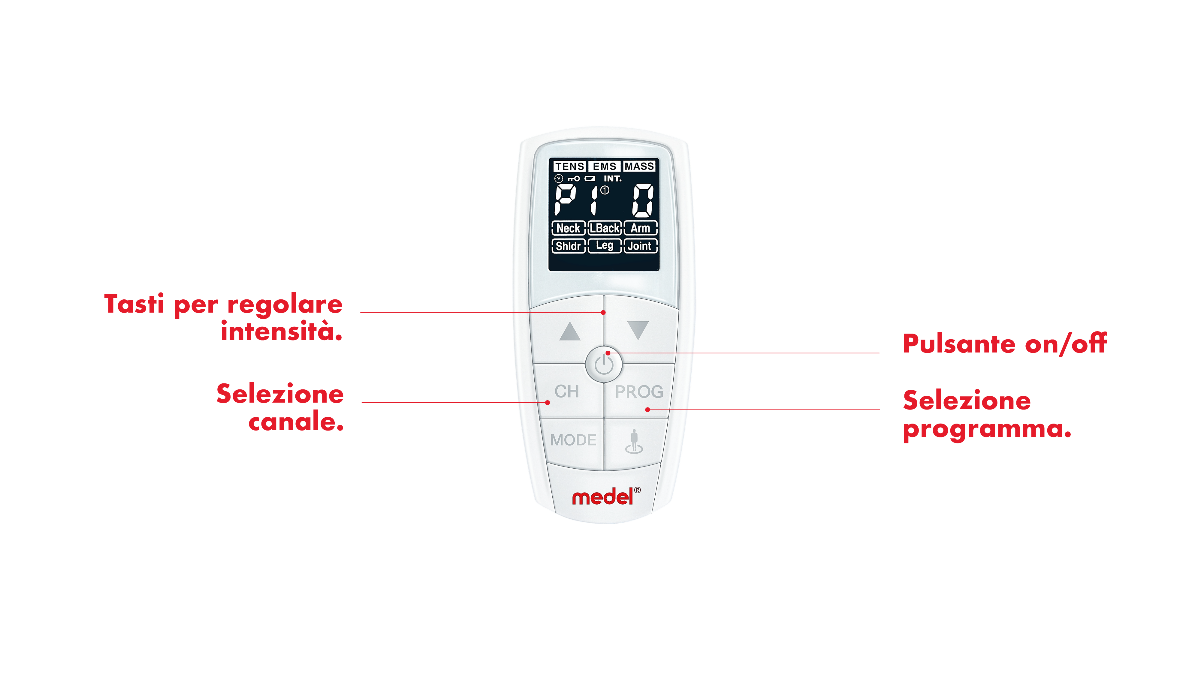 Medel MYO-TENS offre 14 programmi pre-impostati (6 TENS, 5 EMS, 3 MASSAGE) per trattare differenti parti del corpo e diverse tipologie di dolore. È possibile inoltre scegliere tra 25 diversi livelli di intensità di terapia. Dispositivo medico classe lla.