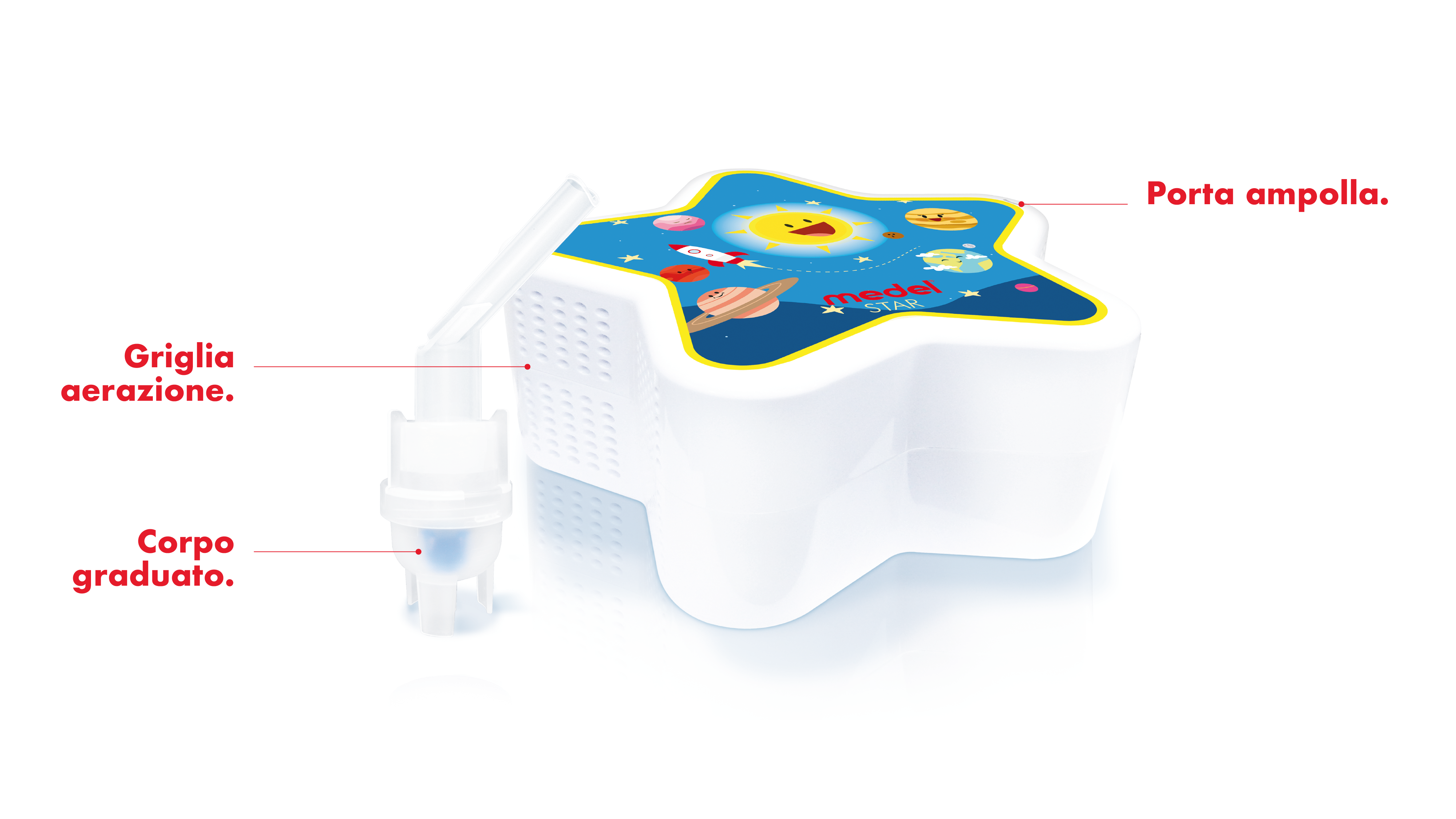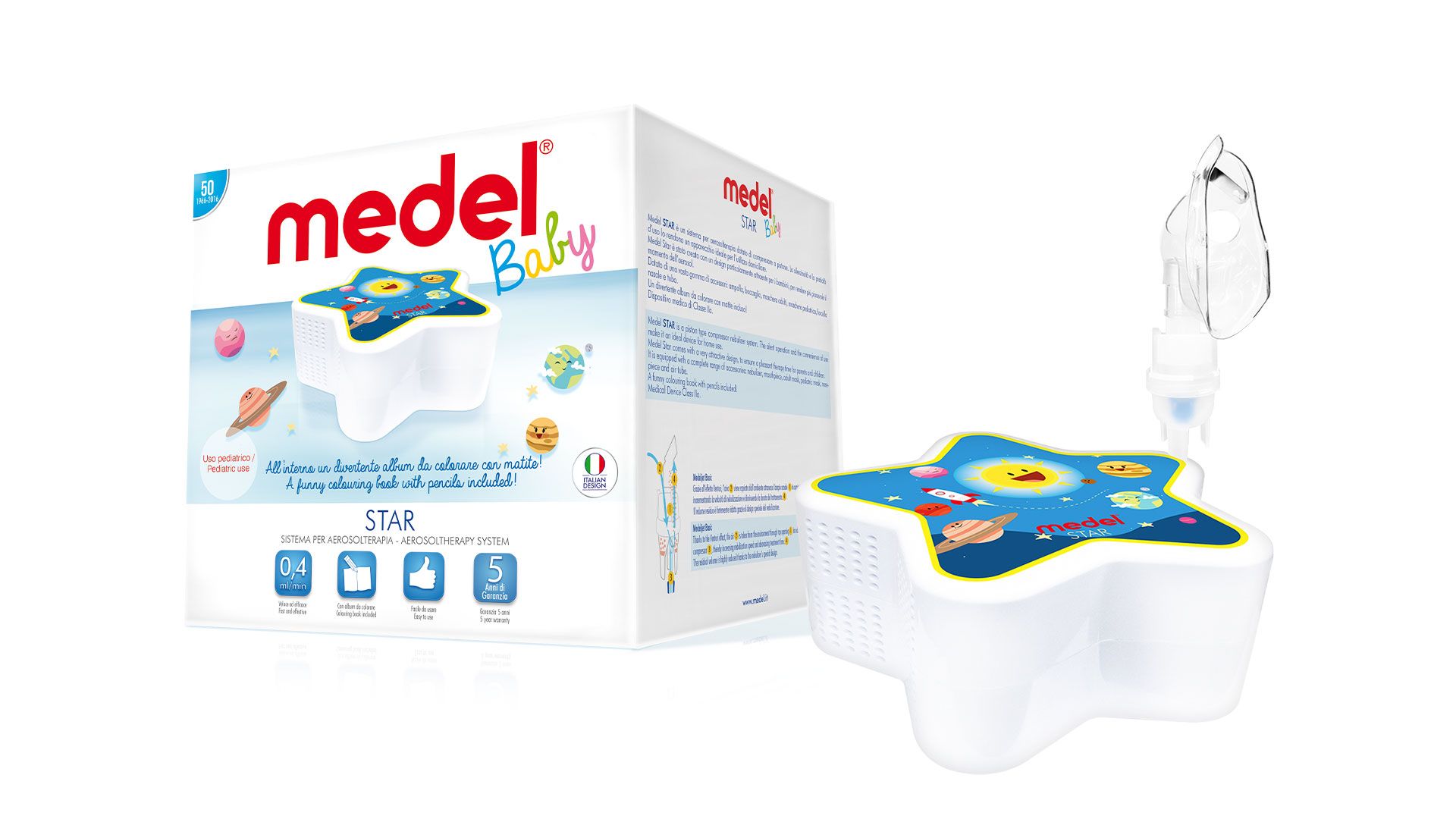 La silenziosità e la praticità d’uso lo rendono un apparecchio ideale per l’utilizzo domiciliare. Star è stato creato con un design particolarmente attraente per i bambini e per rendere più piacevole il momento dell’aerosol.