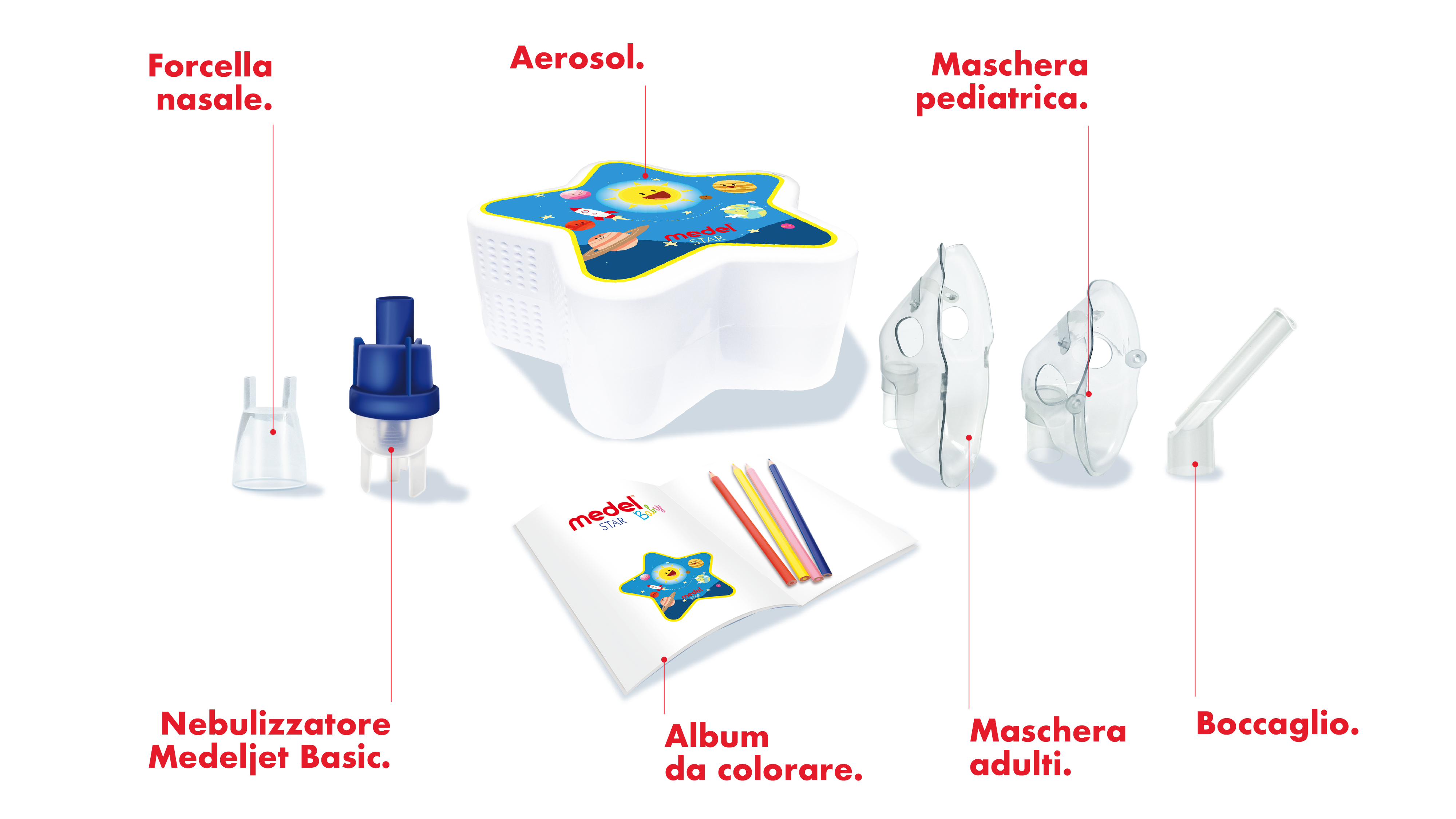 È dotato di una vasta gamma di accessori: ampolla, boccaglio, maschera adulti, maschera pediatrica, forcella nasale e tubo dell’aria. Inoltre, è incluso un divertente album da colorare con matite.