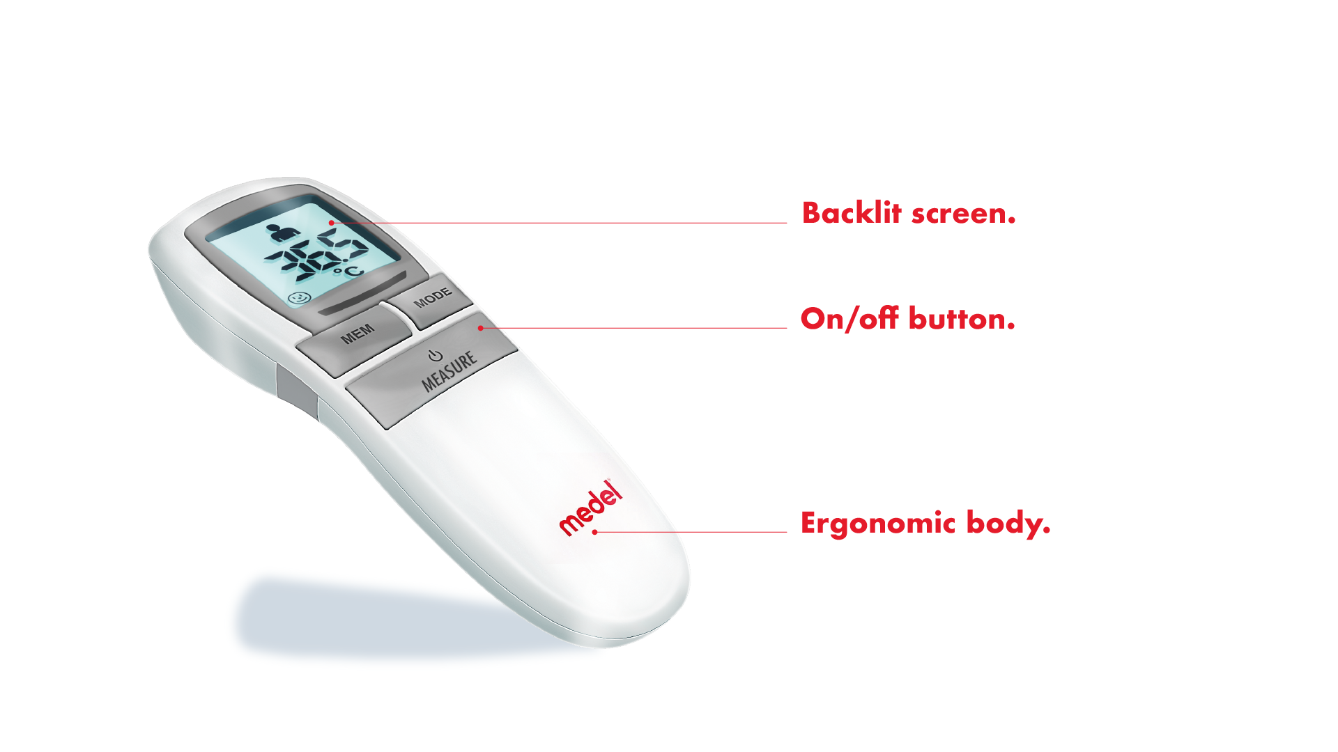 Medel NO CONTACT is an infrared thermometer that is able to detect the body temperature without con- tact. It is multifunctional and measures accurately body temperature as well as the temperature of objects and liquids.
