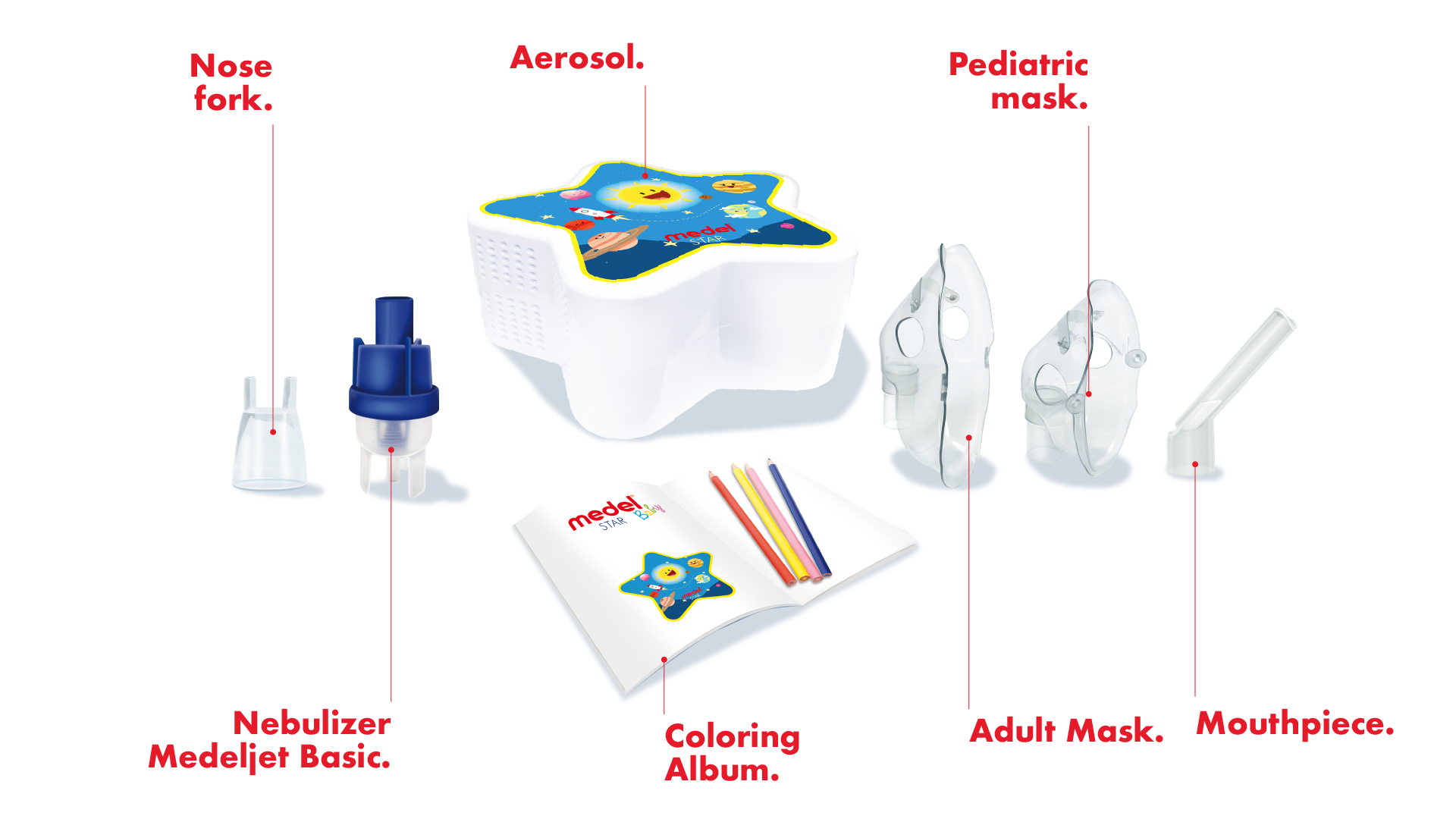 The package includes: 5 air filters, nosepiece, Medeljet Basic nebulizer, adult and pediatric masks, mouthpiece, air tube, colouring book with pencils, storage bag. 5-Year-Warranty