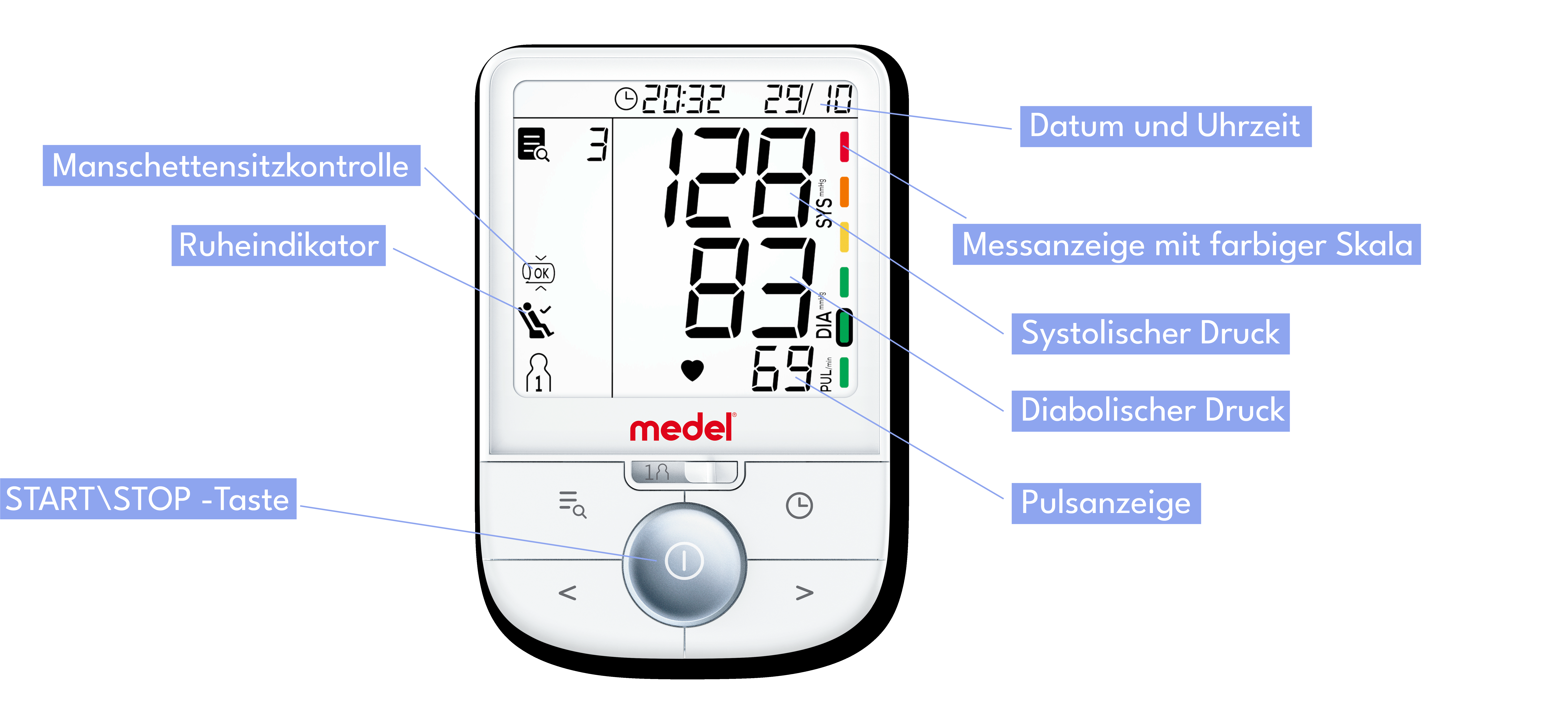 Das Blutdruckmessgerät ist vielen praktischen Details ausgestattet: die Dreifachmessung dient zur Ermittlung noch genauerer Messwerte und wird von Ärzten empfohlen. Die Man- schettensitzkontrolle unterstützt bei der korrekten Positionierung der Manschette. Mit der Funktion „Scan & Save“ können ab sofort die Messwerte der Medel und Beurer Blutdruck- messgeräte digital in der App „beurer HealthManager Pro“ gespeichert werden – auch ohne Bluetooth®.