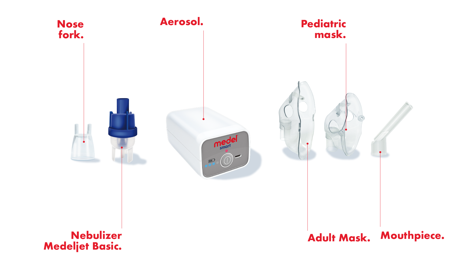 The package includes: 5 air filters, nosepiece, Medeljet Smart nebulizer, adult and pediatric masks, mouthpiece, air tube, power adapter and USB cable and a soft bag. 2-Year-Warranty