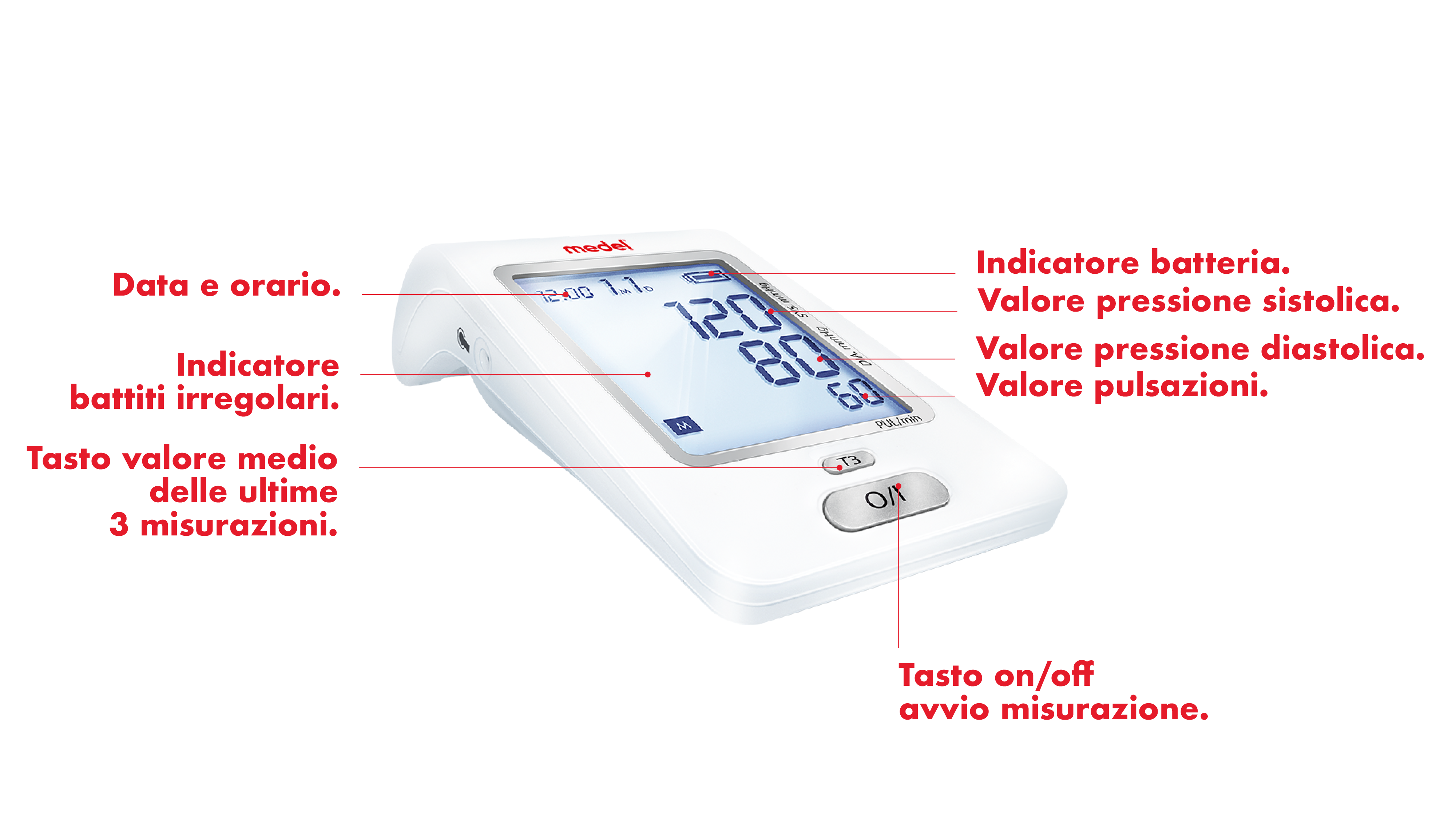 Dotato della funzione T3 che consente di rilevare in modo semplice ed automatico la media delle ultime 3 misurazioni prese nell’arco di 15 minuti. Medel Check per- mette la memorizzazione dei valori misurati per 2 diversi utenti con 60 posizioni di memoria per ciascuno. Dispositivo medico di Classe IIa.