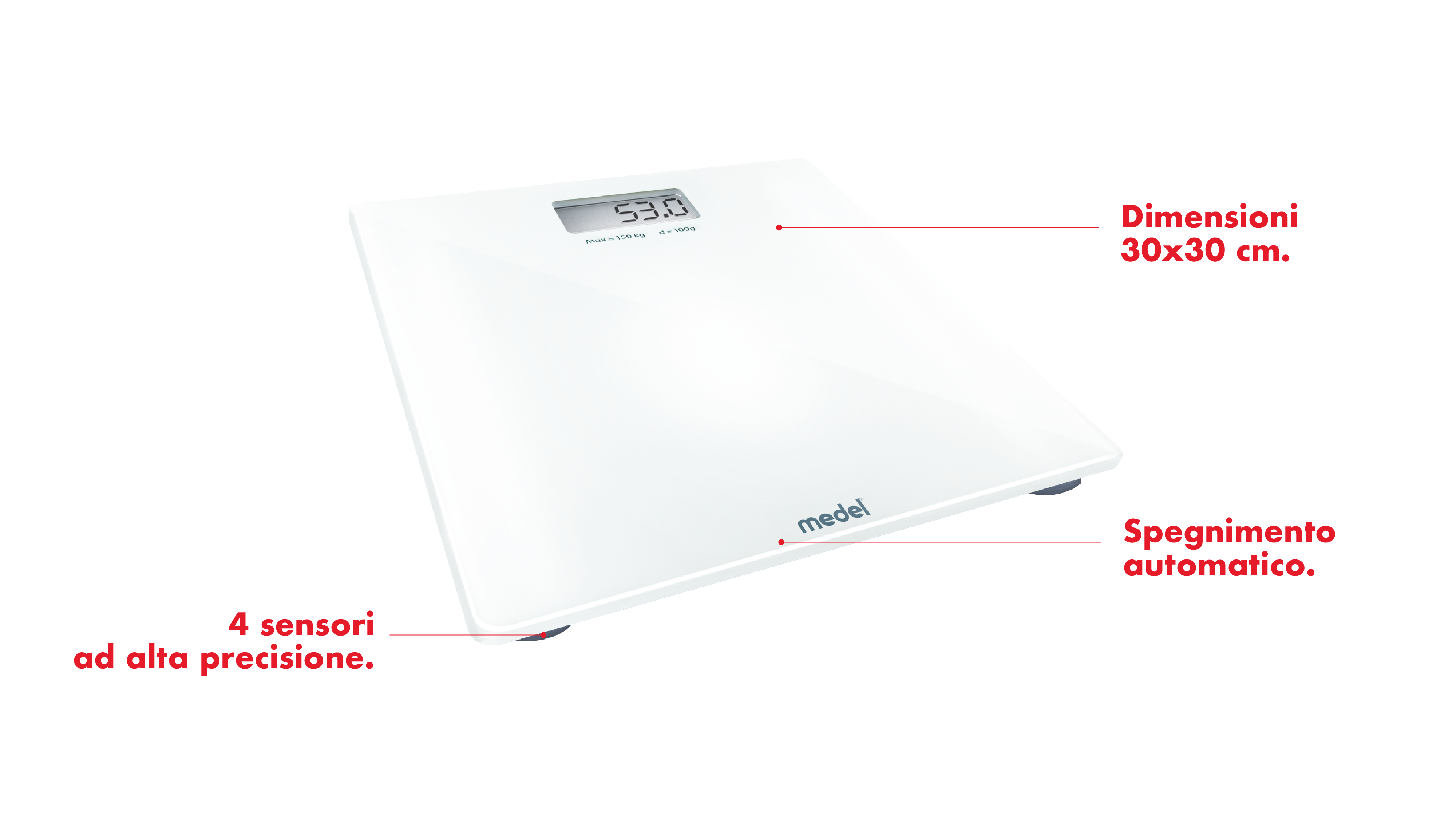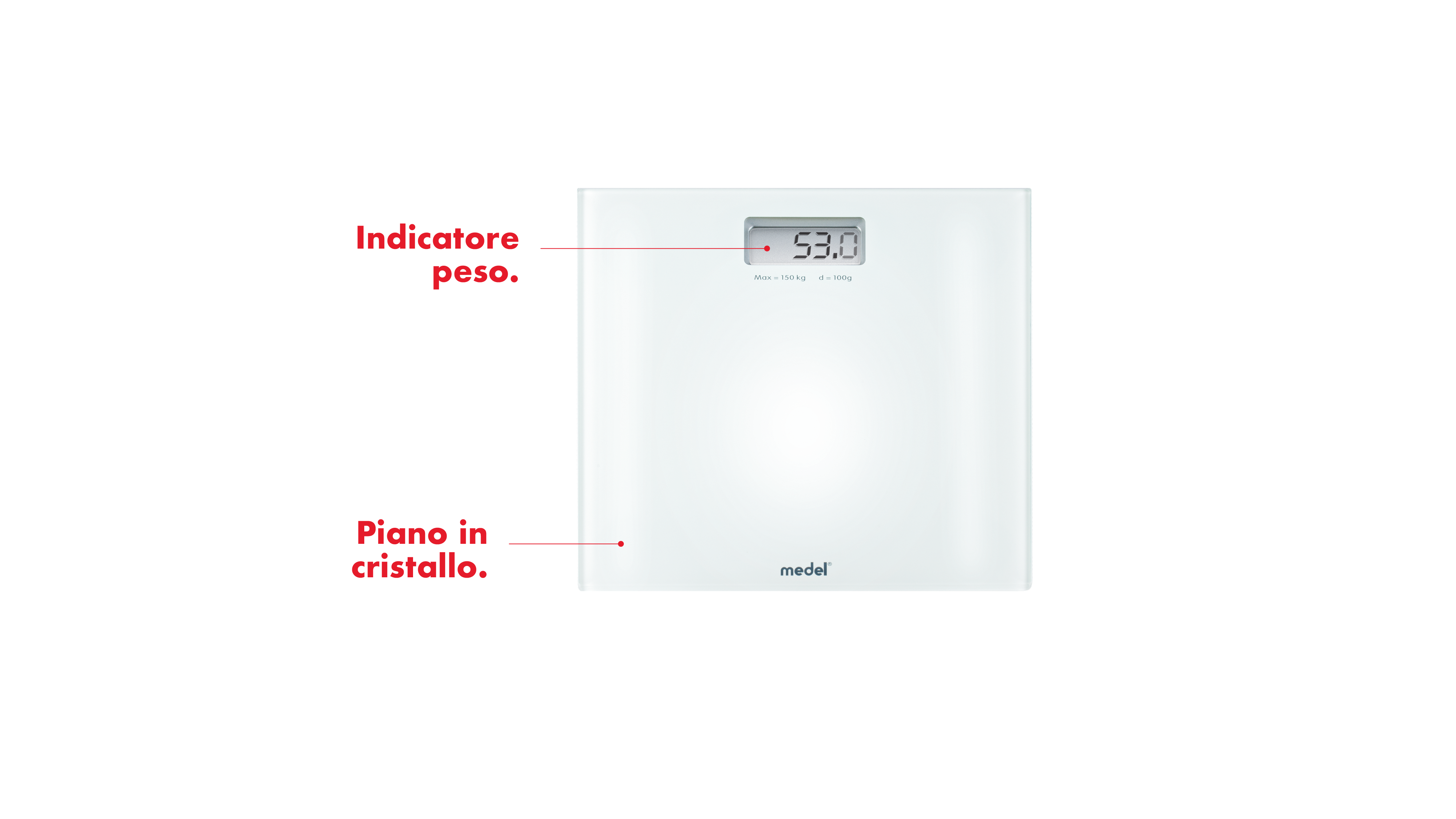 Medel Crystal è una bilancia pesa-persone digitale. L'accuratezza nella precisione è garantita dal sistema brevettato "4 sensori ad alta precisione" che assicura la massima precisione indipendentemente da dove si posizionano i piedi.