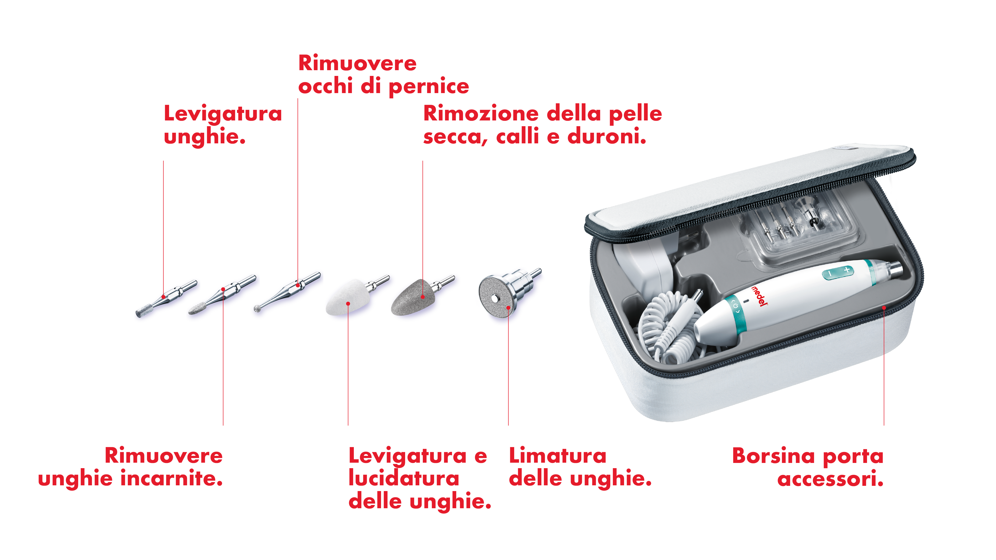 Medel MANICURE/PEDICURE EXPERT è il set professionale per manicure e pedicure dotato di luce LED per un trattamento preciso delle unghie di mani e piedi. Inclusi nella confezione 6 accessori professionali e pratica borsina per il trasporto.