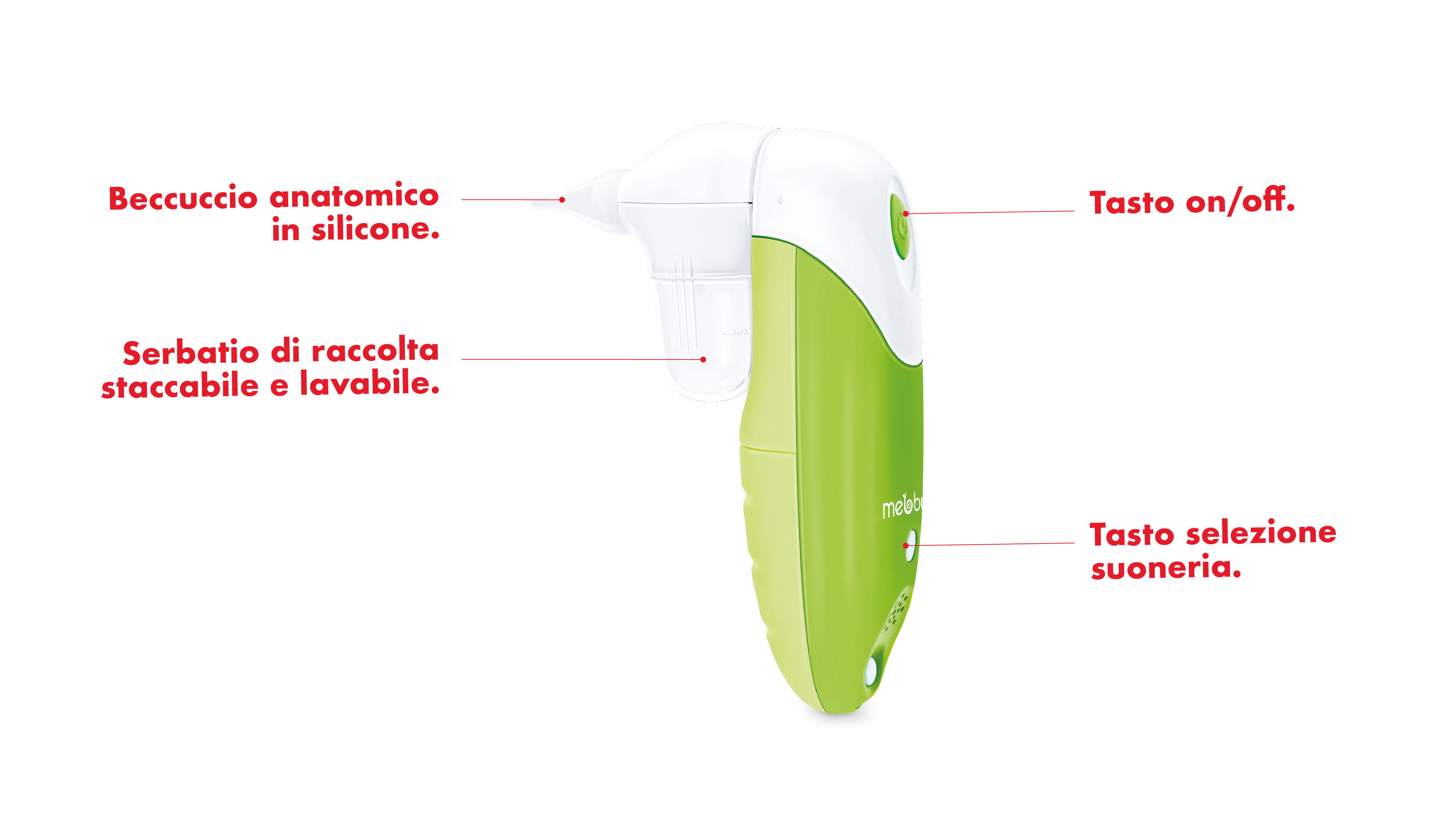 Mebby Nose Clean è compatto e facile da usare, con filtro interno per una maggiore sicurezza e affidabilità. Funziona con batterie stilo ed è dotato di un compressore silenzioso, con la possibilità di attivare e selezionare fino a 12 suonerie per intrattenere il bambino durante l’aspirazione. Dotato di serbatoio per la raccolta del muco interamente lavabile.