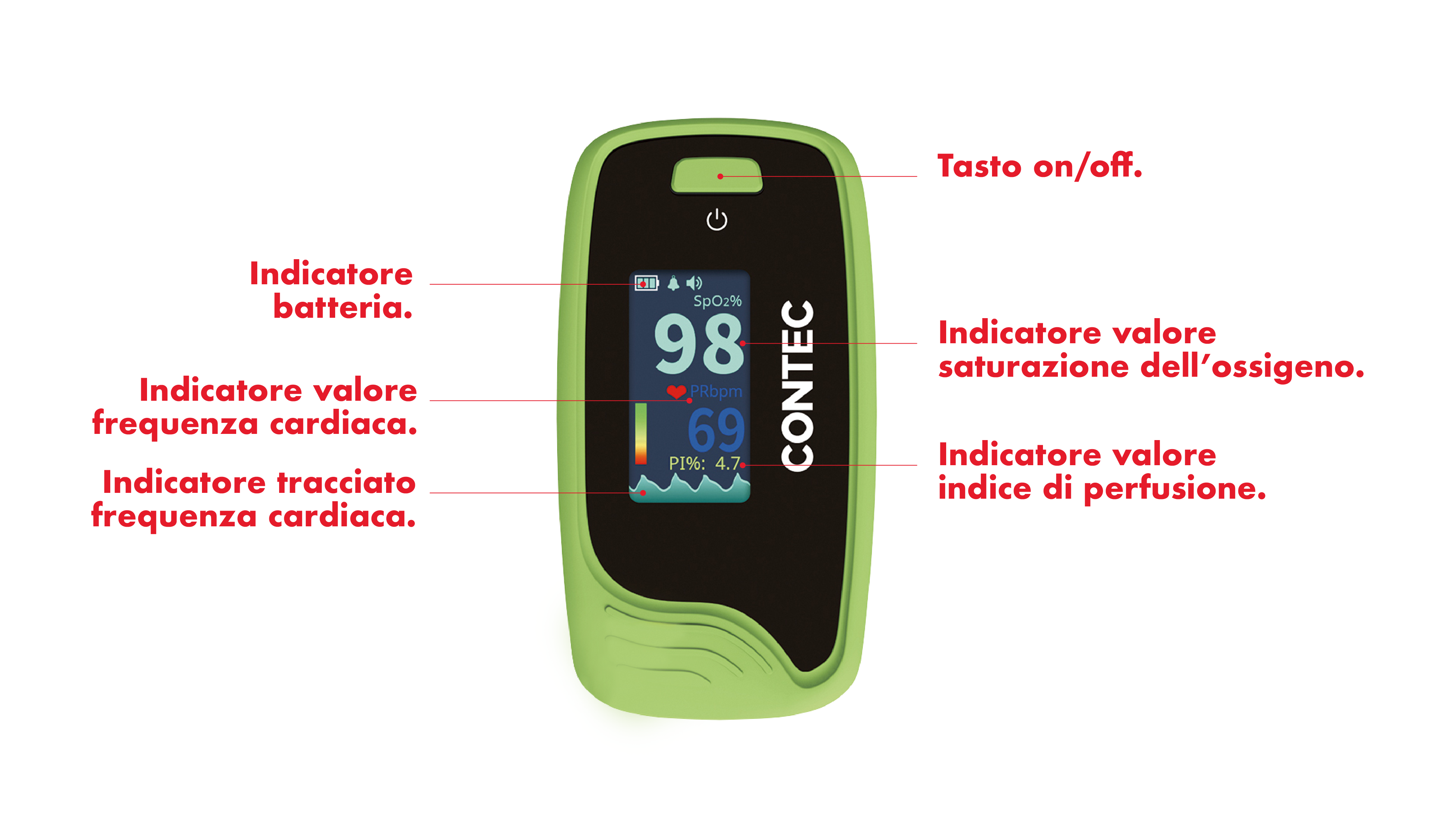 | Range di misurazione | SpO2 0 – 100%, pulsazioni 0 – 254 battiti /minuto |